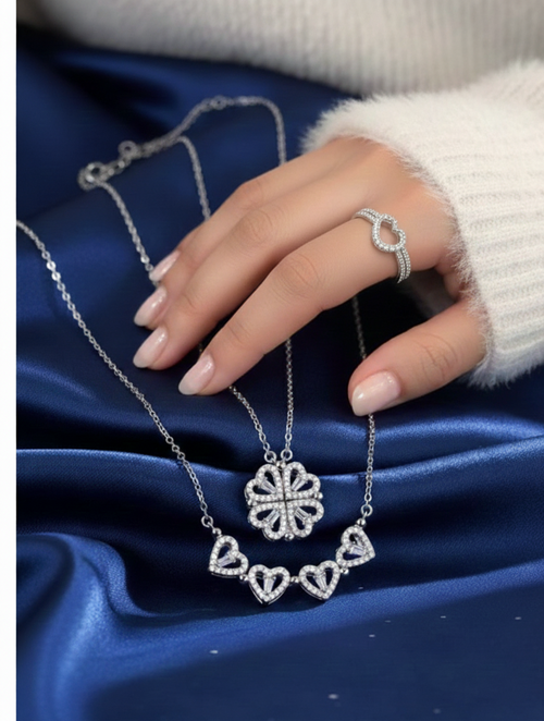 Kadın Paslanmaz Çelik Zirkon Taşlı Yonca Kolye & Kalp Yüzük Seti